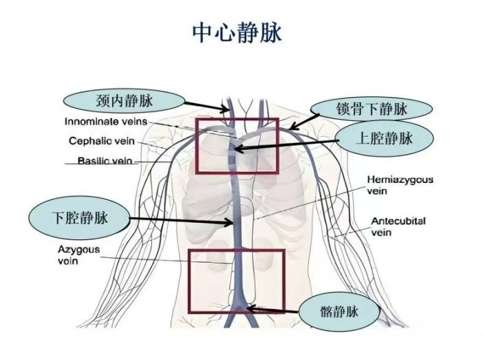 血管通路相关的中心静脉一般是指位于胸腹腔深处的"主干道"。它负责把血液从手臂、颈部、下肢等地方收集起来,再送回心脏。这些"主干道"包括了锁骨下静脉、头臂静脉、上腔静脉、髂静脉、下腔静脉。