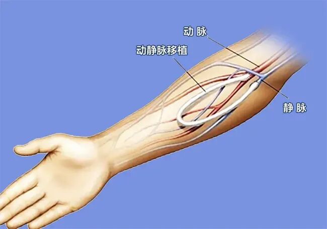 人工血管动静脉内瘘(AVG):当自身血管条件不好时,可以选择性建立人工血管内瘘。是在患者的动脉和静脉之间,利用隧道器在皮下埋入一根人工血管,人工血管的两端分别与自身的动、静脉进行吻合从而建立内瘘。