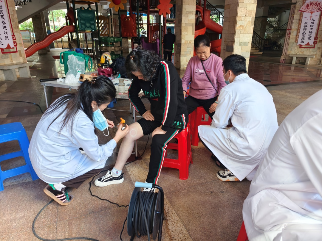活动现场,高年资的骨科、康复医学科及相关术科医师耐心为前来咨询的居民答疑解惑,提供专业的健康指导和慢性病管理建议;康复治疗师团队则为前来咨询的社区居民现场体验了现代康复技术与中医传统特色疗法,如冲击波、中低频等治疗,以及推拿、棍点理筋手法、耳穴压豆、拔罐、中药贴敷等中医传统特色疗法,活动现场吸引了众多居民驻足参与。护理人员有序为居民测量血压、血糖,并开展健康宣教,增强群众的自我保健意识。