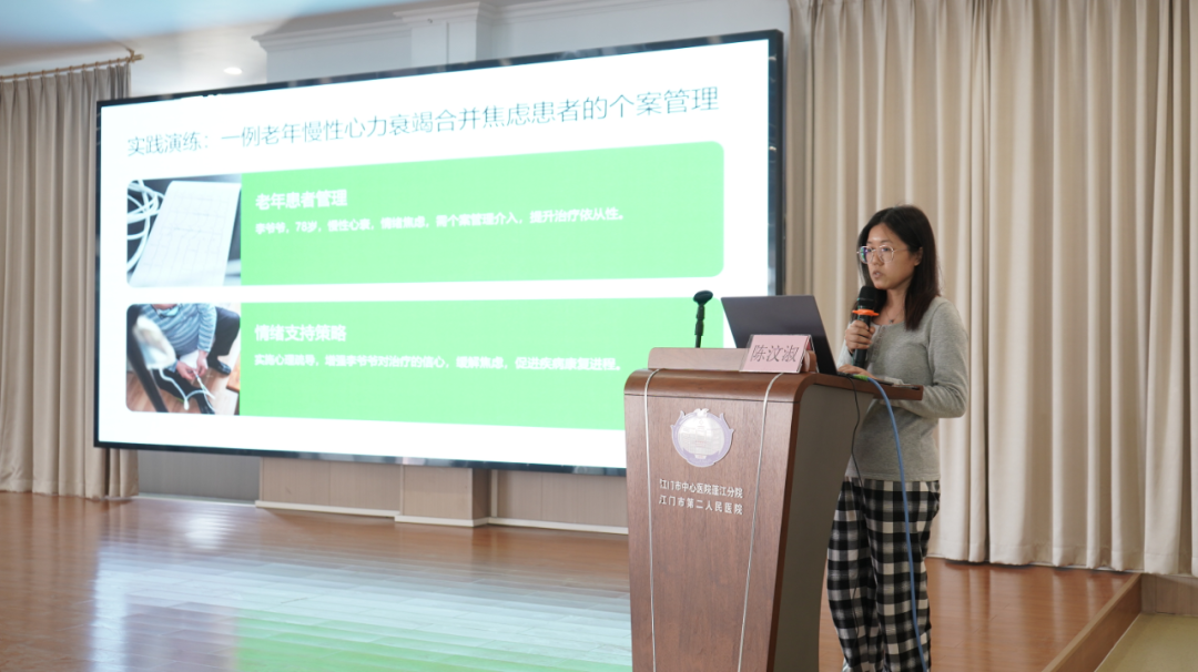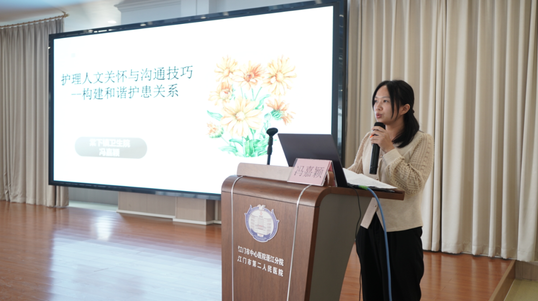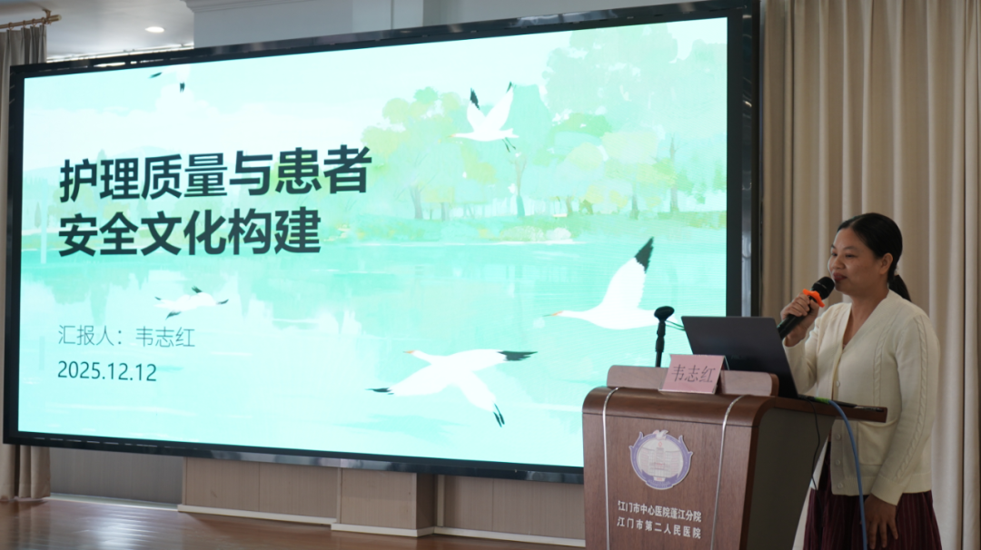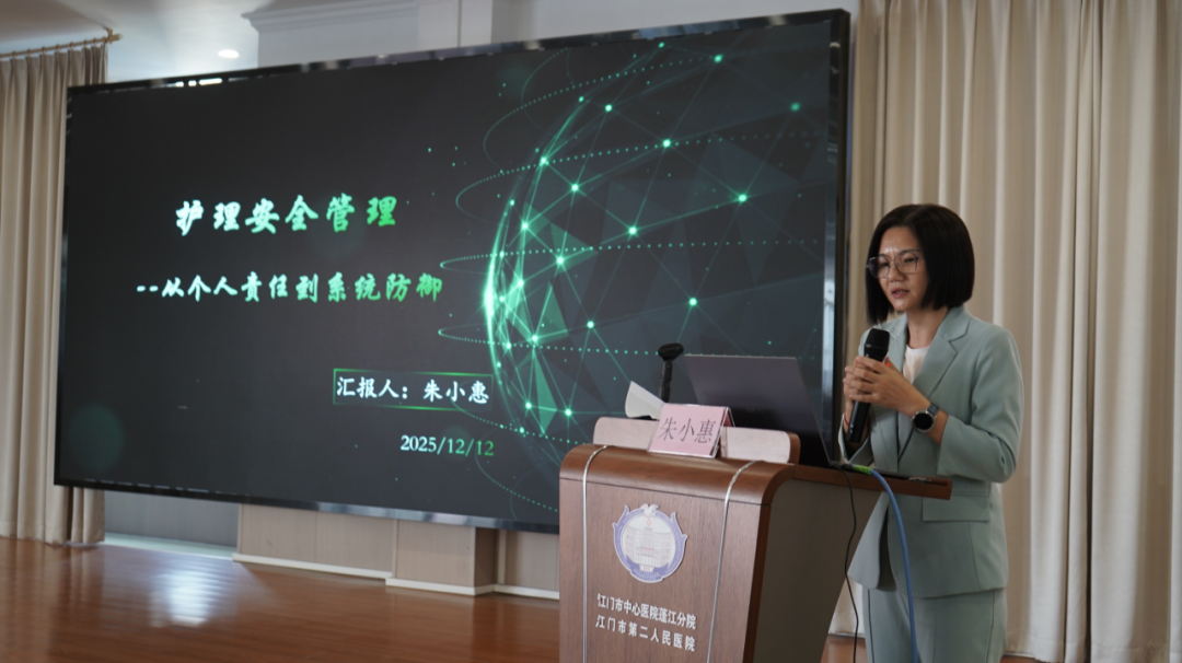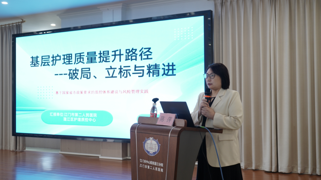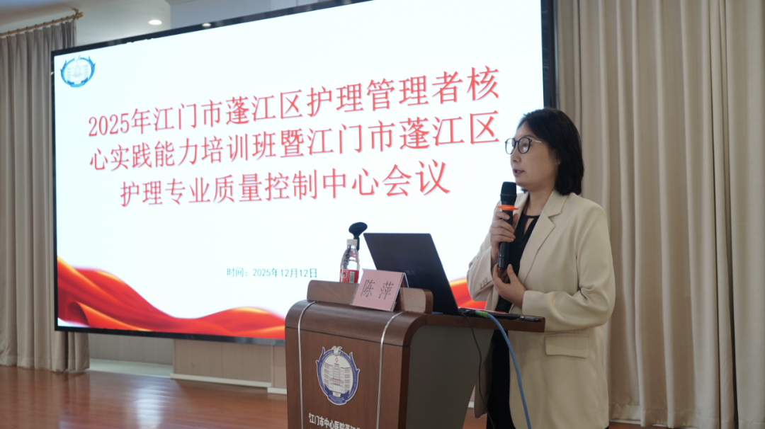 本次培训得到江门市护理学会科技服务站的大力支持,标志着市级优质护理教育资源精准下沉基层。活动伊始,区护理学会会长、区护理质控中心主任(江门市第二人民医院护理部组长)陈萍致开幕词。她强调,此次培训是落实上级部署、发挥区质控中心挂靠单位组织引领作用的关键举措,旨在通过“送教上门”的形式,将前沿理念与实用工具直接输送至基层管理一线。她寄语全体学员把握宝贵学习机会,将所学转化为提升本单位护理质量与安全的具体行动,共同筑牢区域护理安全网。