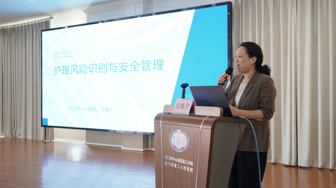 培训课程精准对接基层管理核心需求,内容系统且注重实效。江门市护理学会科技服务站特邀江门市中心医院护理部副主任汪海芹开展《护理风险识别与安全管理》专题授课,系统构建了科学的风险防控框架。随后,区内六家医疗机构(江门市第二人民医院、蓬江区中西医结合医院、棠下镇卫生院、荷塘镇卫生院、杜阮镇卫生院及潮连医院)的专家依次进行了课程分享,分别围绕质量提升路径、科研创新、人文沟通、不良事件管理、安全文化构建及个案管理等核心议题,结合实战案例进行了详细的讲解,为参训者带来了多维度的专业赋能。