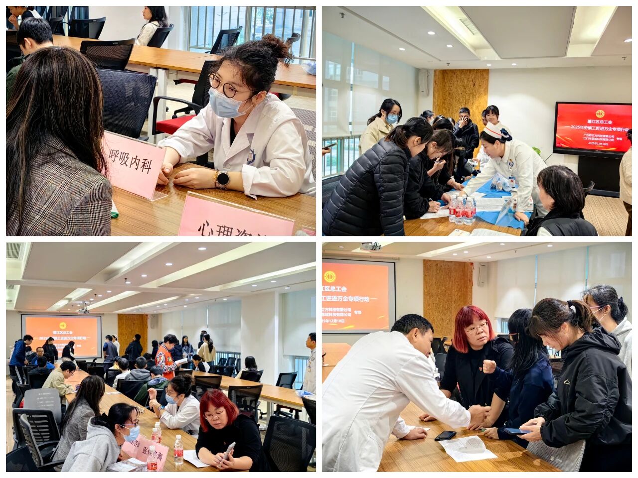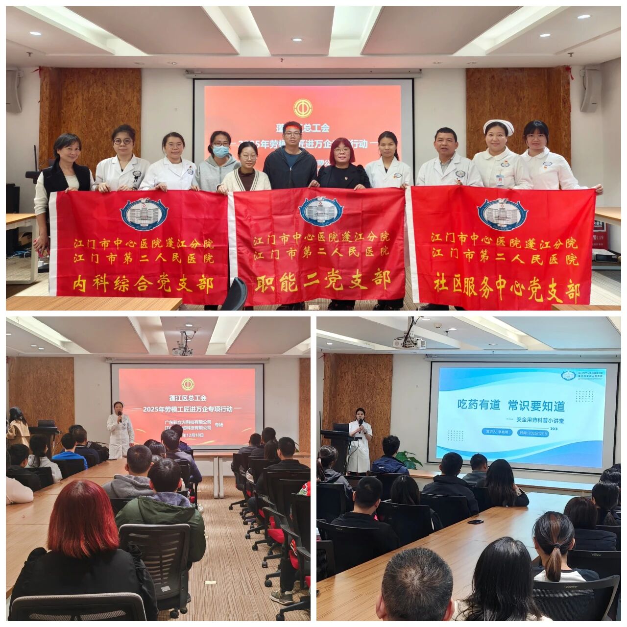12月18日,我院社区服务中心党支部、职能二党支部、内科综合党支部联合行动,应蓬江区总工会邀请赴江门市思域科技有限公司开展健康义诊暨科普活动。活动现场设置医保政策咨询、心理咨询、用药咨询服务台,同步开展心肺复苏、外伤急救实操教学及安全用药知识科普。企业职工参与热情高涨,现场气氛热烈。此次活动切实提升了职工的急救实操能力与安全用药意识,获得一致好评。