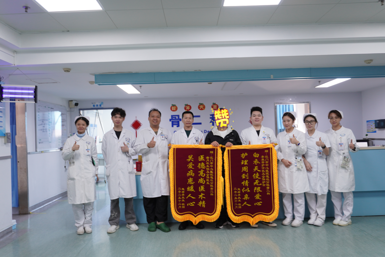 12月21日,患者李先生将两面分别写有“医德高尚医术精 关爱病患暖人心”和“白衣天使无限爱心 护理周到情似亲人”的锦旗送到了骨二科医护人员手中,以此表达对医护的由衷感谢。两面锦旗是对骨二科团队技术与服务的最大肯定,激励医护不断创新技术,提升服务质量,为广大患者的健康保驾护航!