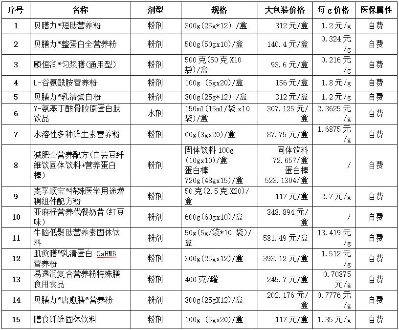 为满足患者的营养治疗需求,我院临床营养科为广大患者提供营养筛查、营养评估、营养会诊、营养健康指导、肠内营养制剂配制等服务。我院本着公平、合法和诚实信用的原则,根据成本和市场情况,同时也保障消费者知情权,现将院内营养制剂价格公示如下:
