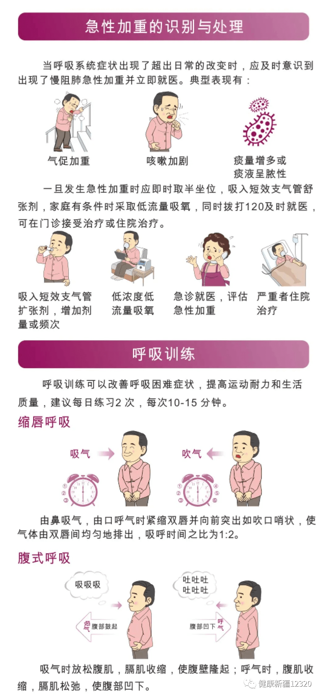 戒烟:吸烟是导致慢阻肺的“头号凶手”,不管烟龄多久,戒烟后肺功能下降的速度会明显变慢,症状也会减轻,这是最有效、最经济的预防方法。