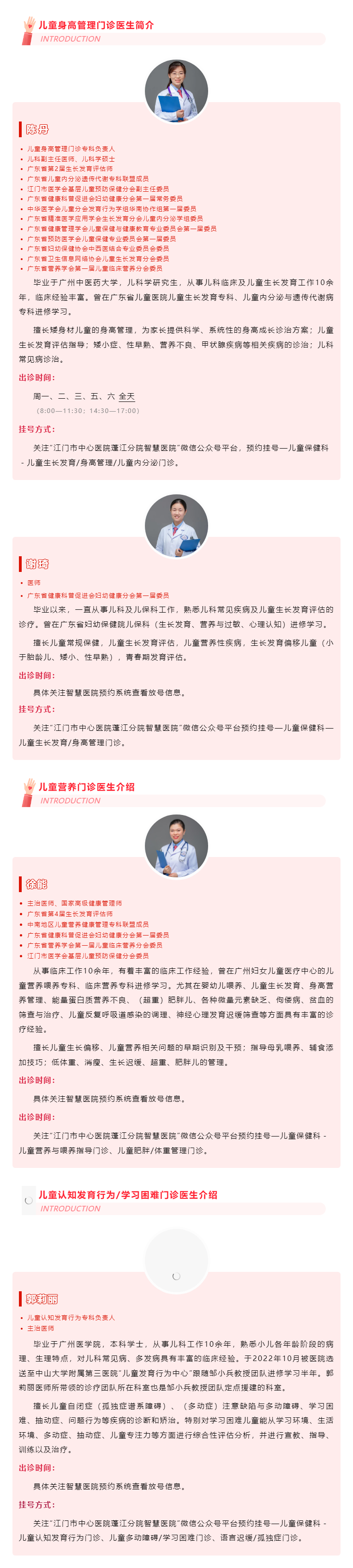 儿童营养管理/儿童认知发育行为(儿童营养不良、肥胖、学习困难、语言发育迟缓、孤独症、注意力缺陷多动障碍等),可以关注“江门市中心医院蓬江分院智慧医院”微信公众号平台预约挂号—儿童保健科—选择相应专科(营养与喂养指导门诊、儿童肥胖/体重管理门诊、儿童认知发育行为门诊、学习困难/多动筛查门诊、语言迟缓/孤独症门诊)预约报名。