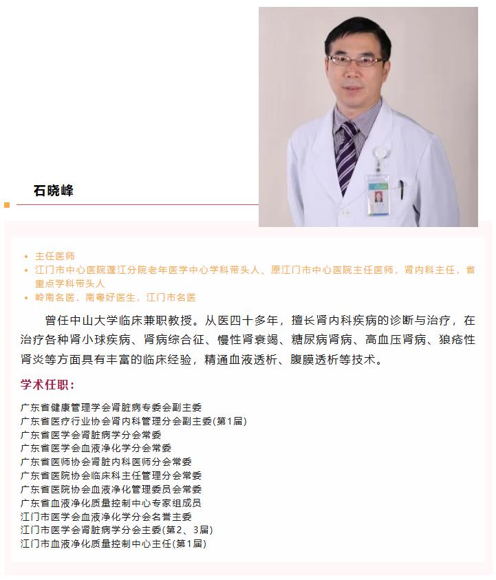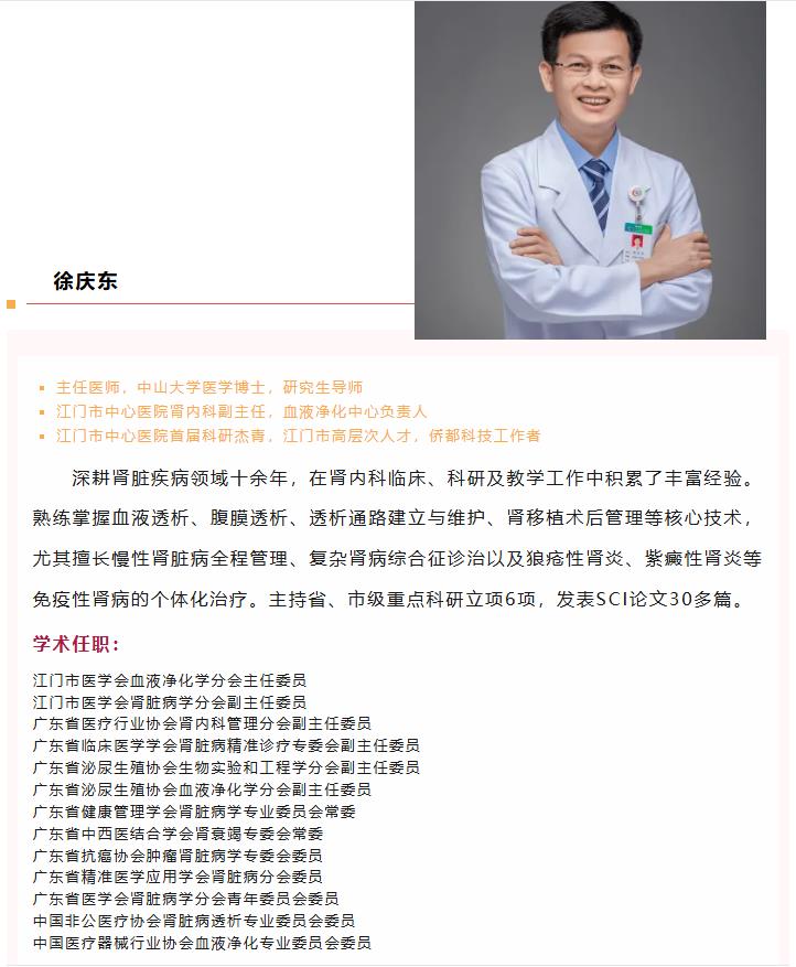 为持续提升我院血液净化中心的学科建设水平与医疗服务质量,让广大透析患者在家门口即可享受到更优质、便捷的医疗资源,我院血液净化中心借助紧密型医联体建设,邀请到江门市中心医院血液净化中心负责人徐庆东主任医师以及原江门市中心医院肾内科主任石晓峰主任医师进驻血液净化中心。两位专家在肾内科及血液净化领域拥有深厚的学术造诣、丰富的临床经验,其中徐庆东主任医师正式受聘为血液净化中心的“柔性引进专家”。