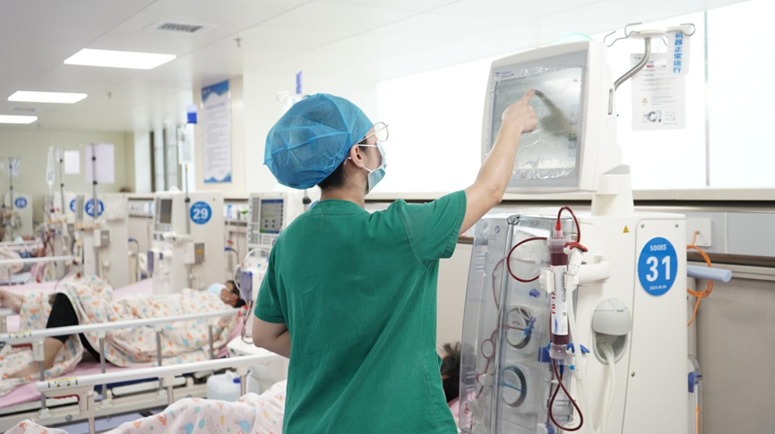拥有先进的大连康仑水处理系统1台,透析机均为德国费森尤斯品牌,其中4008S-V10透析机13台,4008B透析机11台,5008S血滤机3台,4008S血滤机1台,配备有血透患者信息化管理系统、中央设备带供氧及吸痰装置、心电监护仪、除颤仪等设备保障患者透析的安全进行。