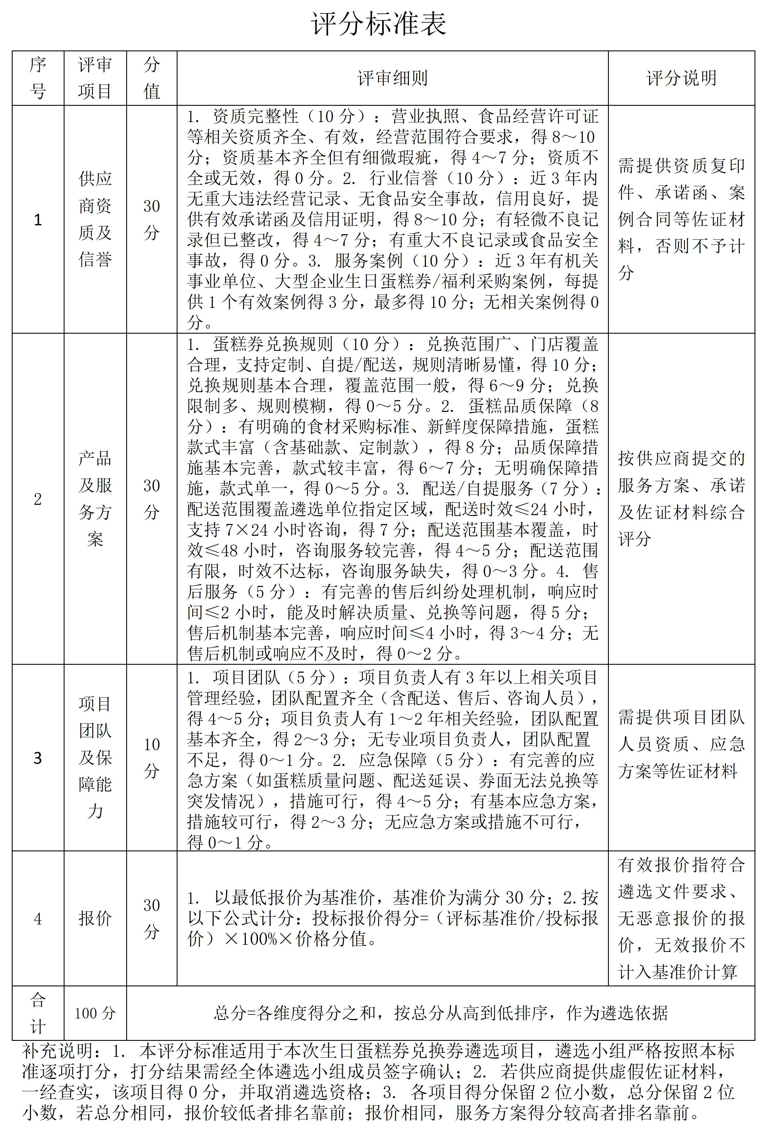 2、产品及服务方案(30 分):蛋糕券兑换规则合理性、蛋糕品质保障措施、配送服务能力、售后服务响应机制等进行评分。