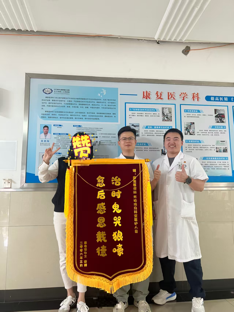3月16日,我院康复医学科方医生收到了一面别具一格的锦旗,上面印有“治时鬼哭狼嚎,愈后感恩戴德”十二个大字。这面与众不同的锦旗,用最质朴诙谐的语言,道出了患者对治疗过程最真实的体验与对疗效最诚挚的肯定。一面锦旗,一份信赖。它承载的不仅是患者的感激,更是对我院康复医技团队精湛技术的褒奖。康复科全体医务人员表示,将继续坚持以患者为中心,用专业与真诚守护每一位患者的健康。