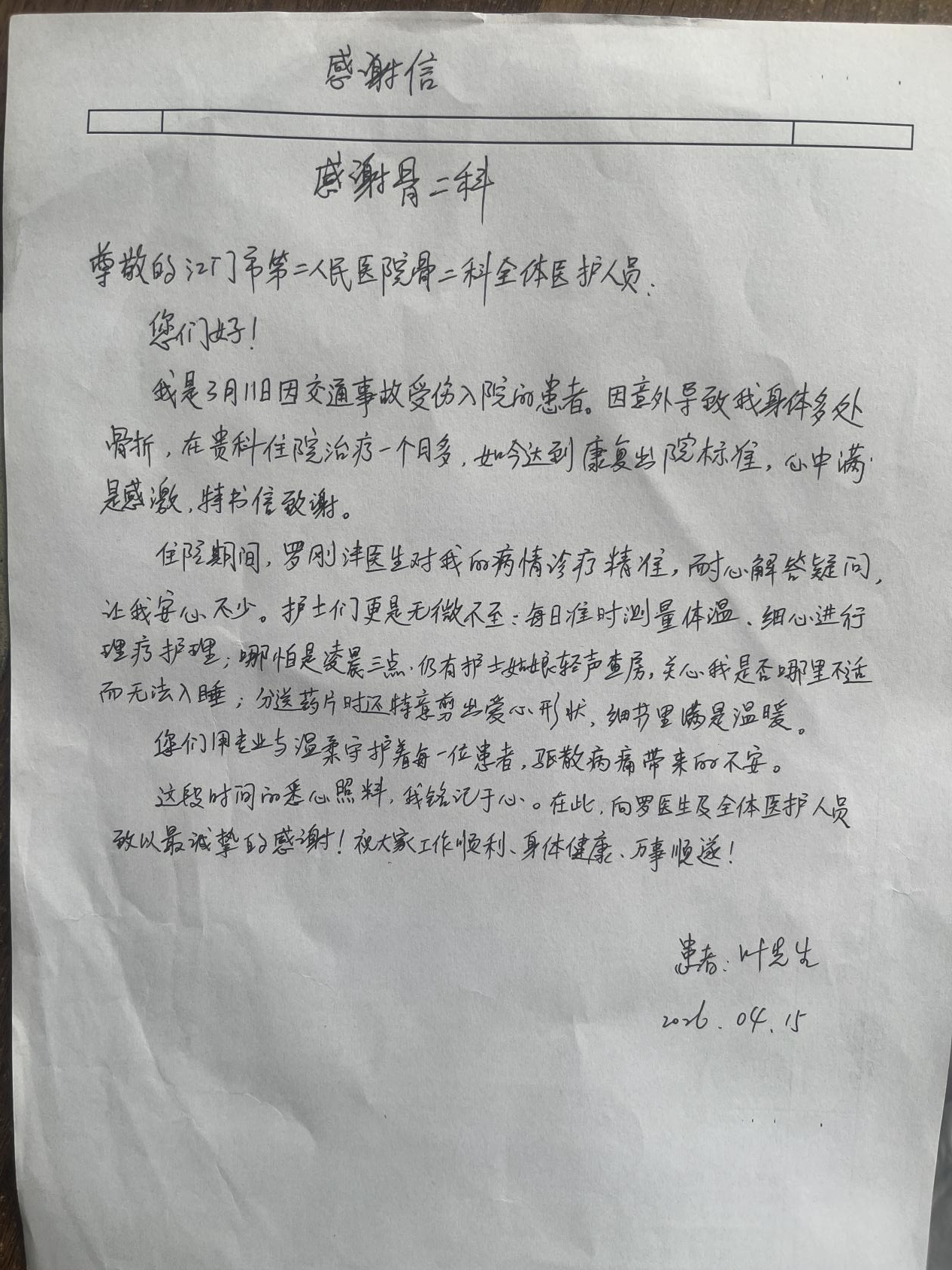 4月15日上午,我院骨二科收到一封饱含深情的感谢信。信中,患者叶先生用朴实真挚的语言,讲述了自己从入院时的痛苦无助到康复出院的全过程,字里行间充满了对骨二科全体医护人员的感激与敬意。骨二科团队表示,将珍藏这份信任,继续砥砺前行,用爱与责任守护每一位患者的健康。