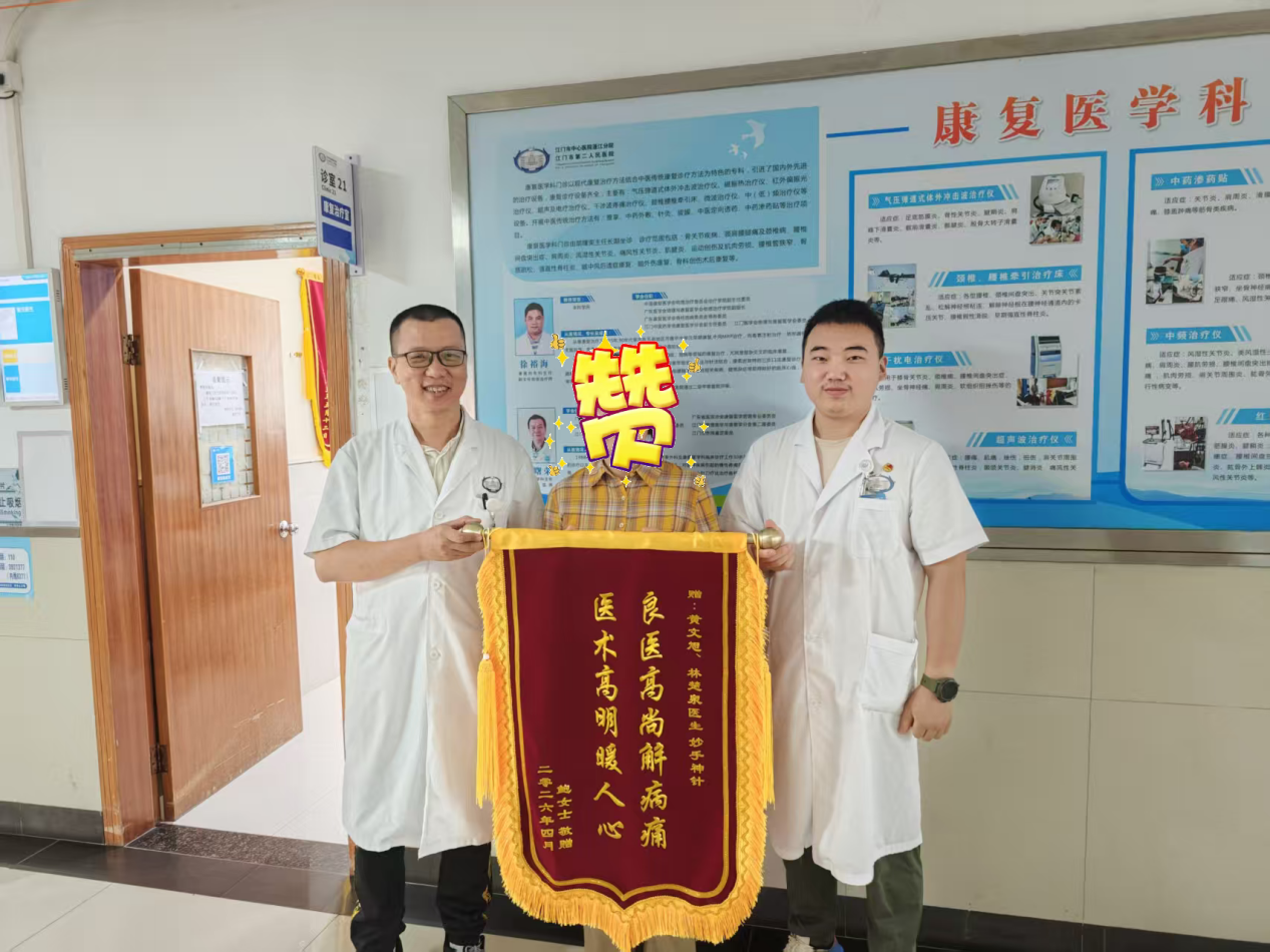 4月17日上午,我院康复医学科上演暖心一幕:患者家属将一面印有“良医高尚解病痛 医术高明暖人心”的锦旗送到医护团队手中,以此感谢科室医护人员在其康复治疗期间的精心救治与悉心照护。锦旗不仅是患者对医护团队的认可,更是对医院康复服务质量的肯定。接下来,我们将继续精进专业技术,优化康复服务,帮助更多患者改善功能、回归家庭与社会,用实际行动诠释医者担当。
